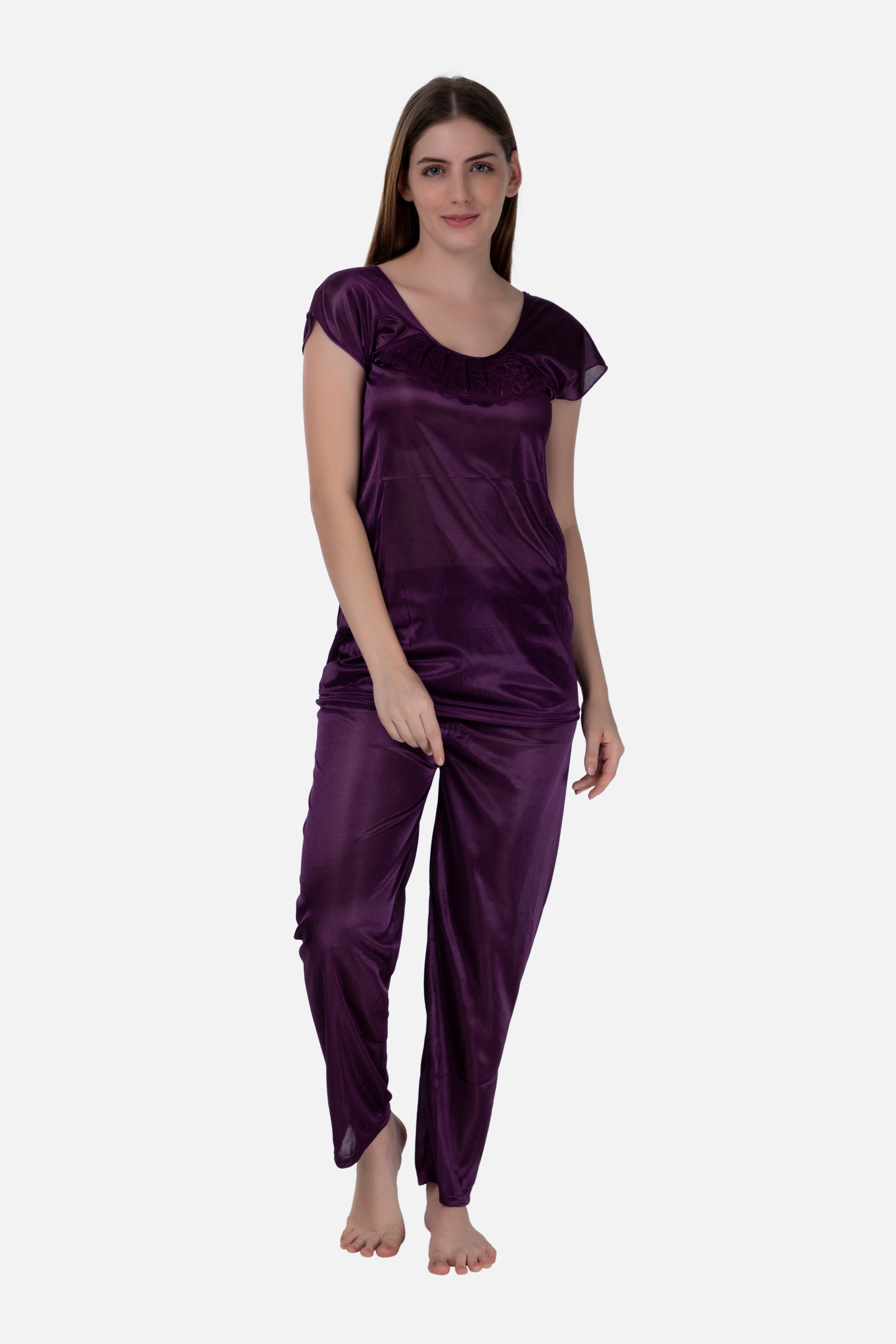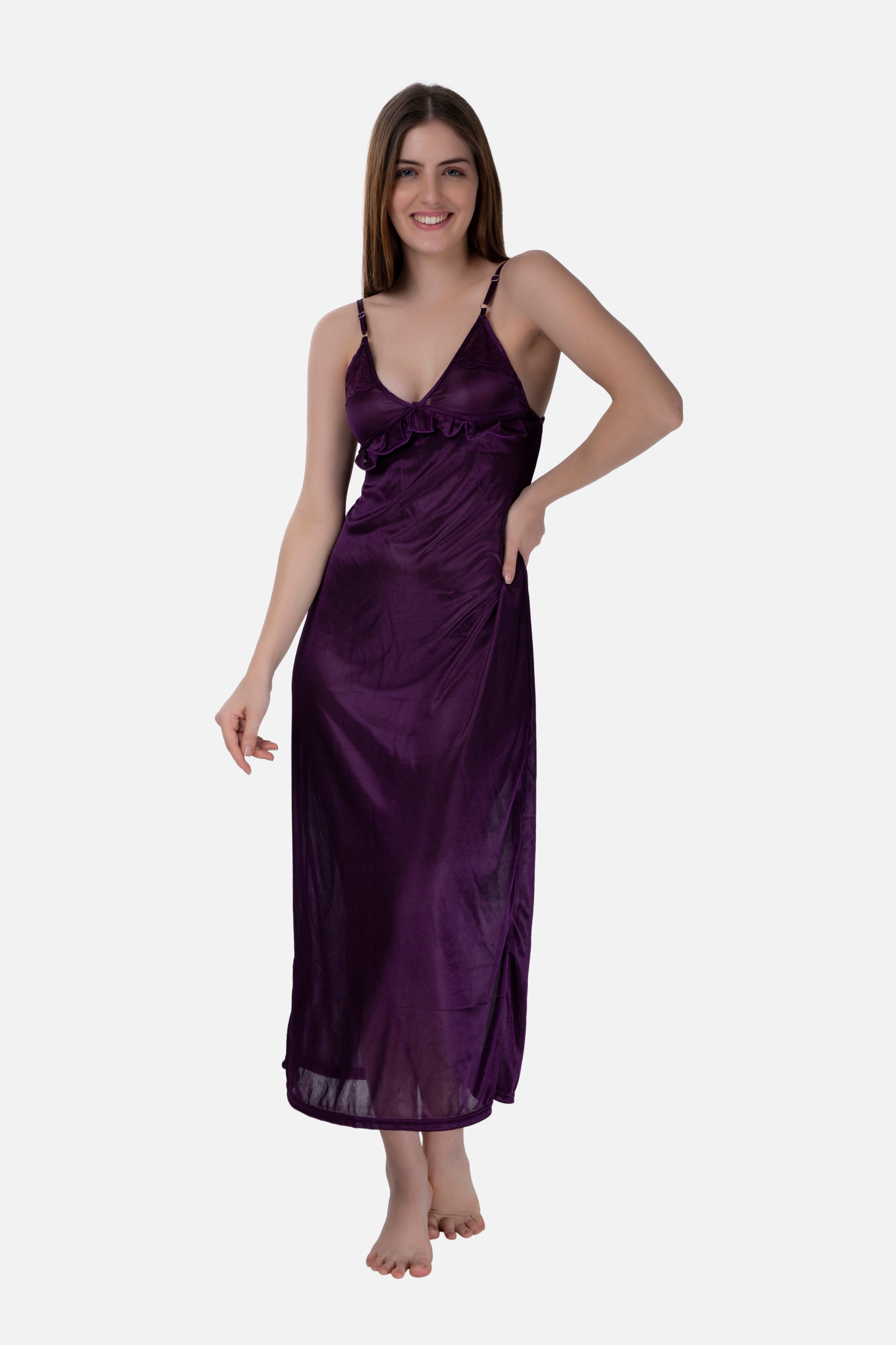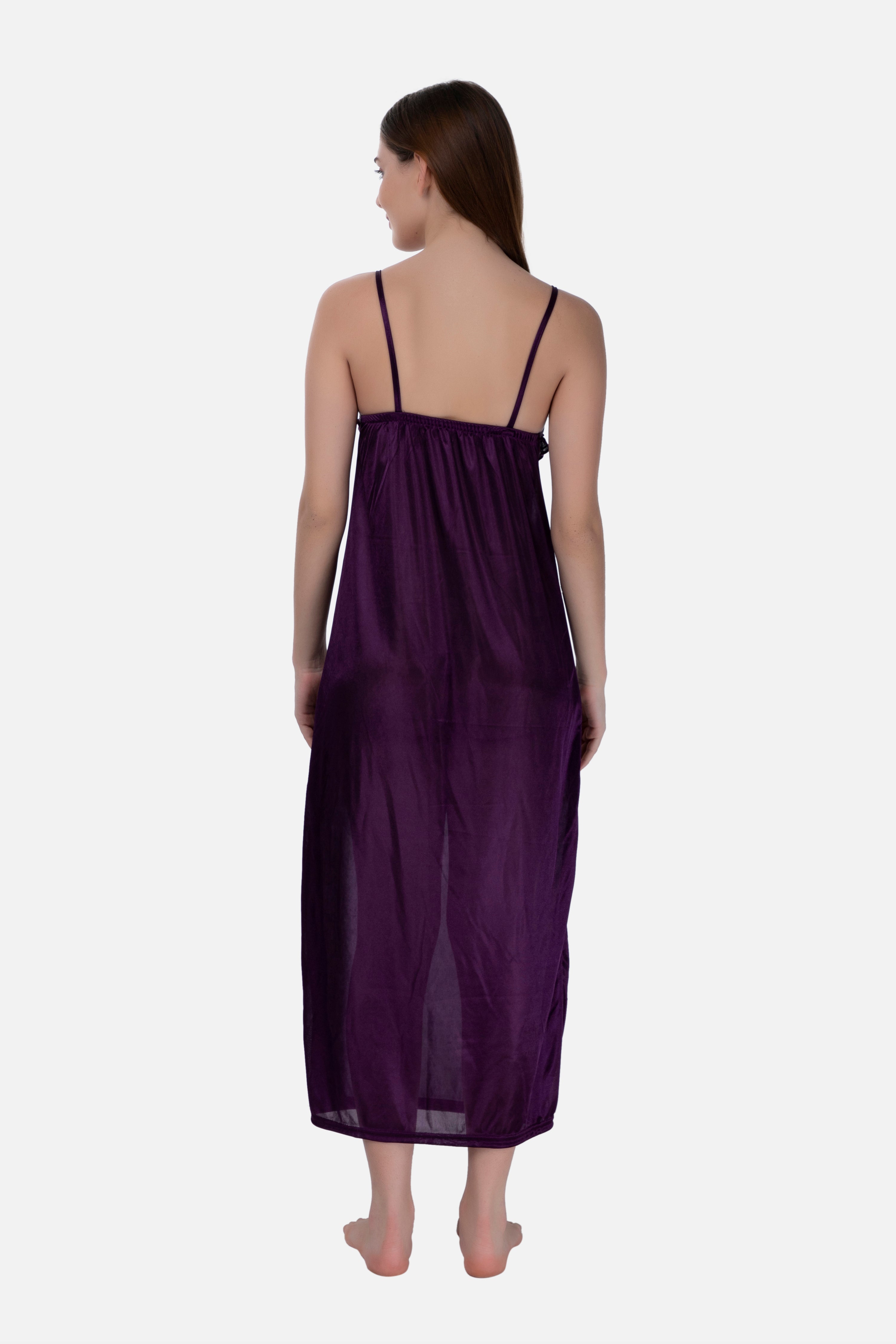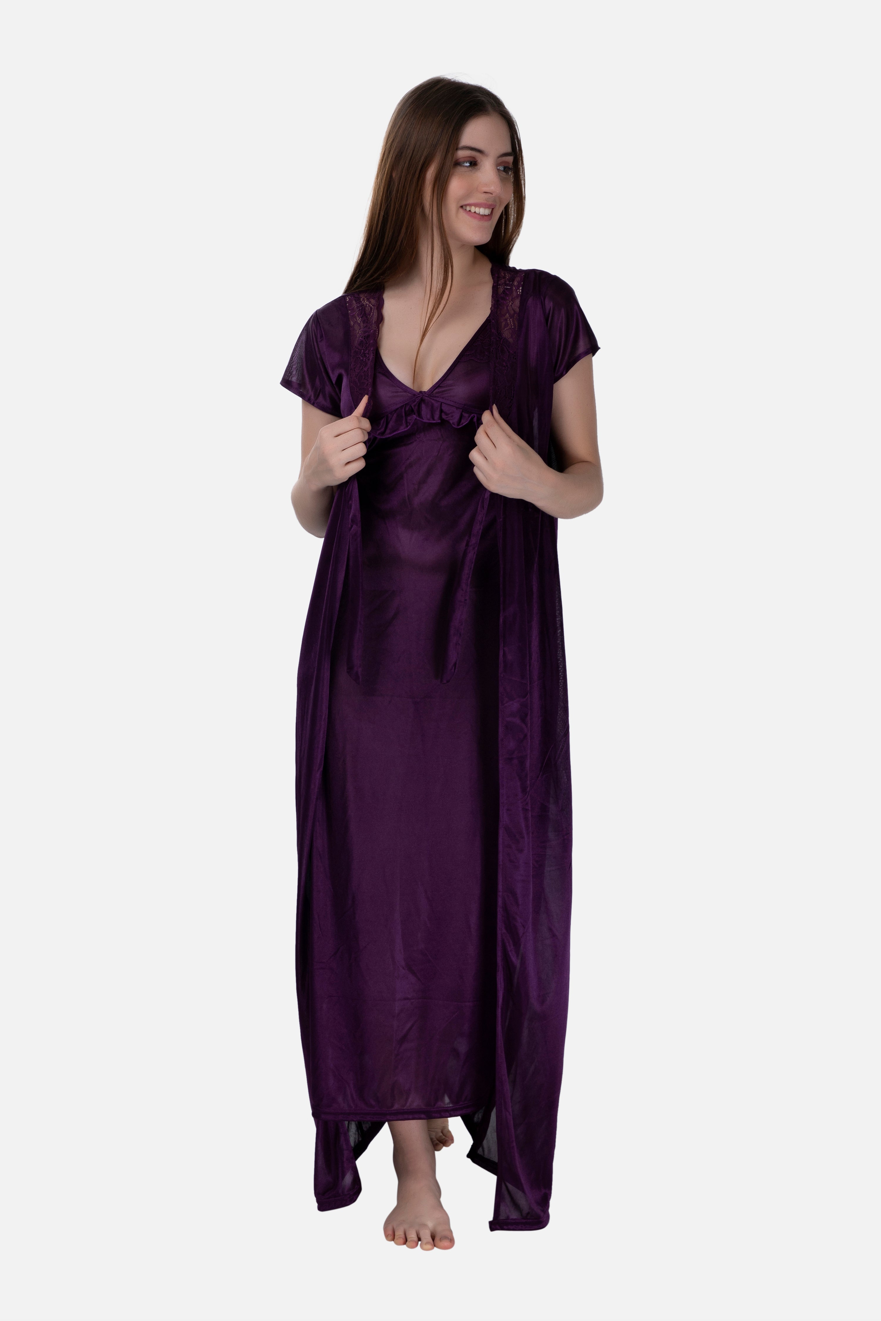 Poftik Satin Nighty with Robe 4Pc Set, Bridal Maxi with Nighty Robe, Top with Pajamas, Night Dress Free-Size - Purple, SKU- 4275