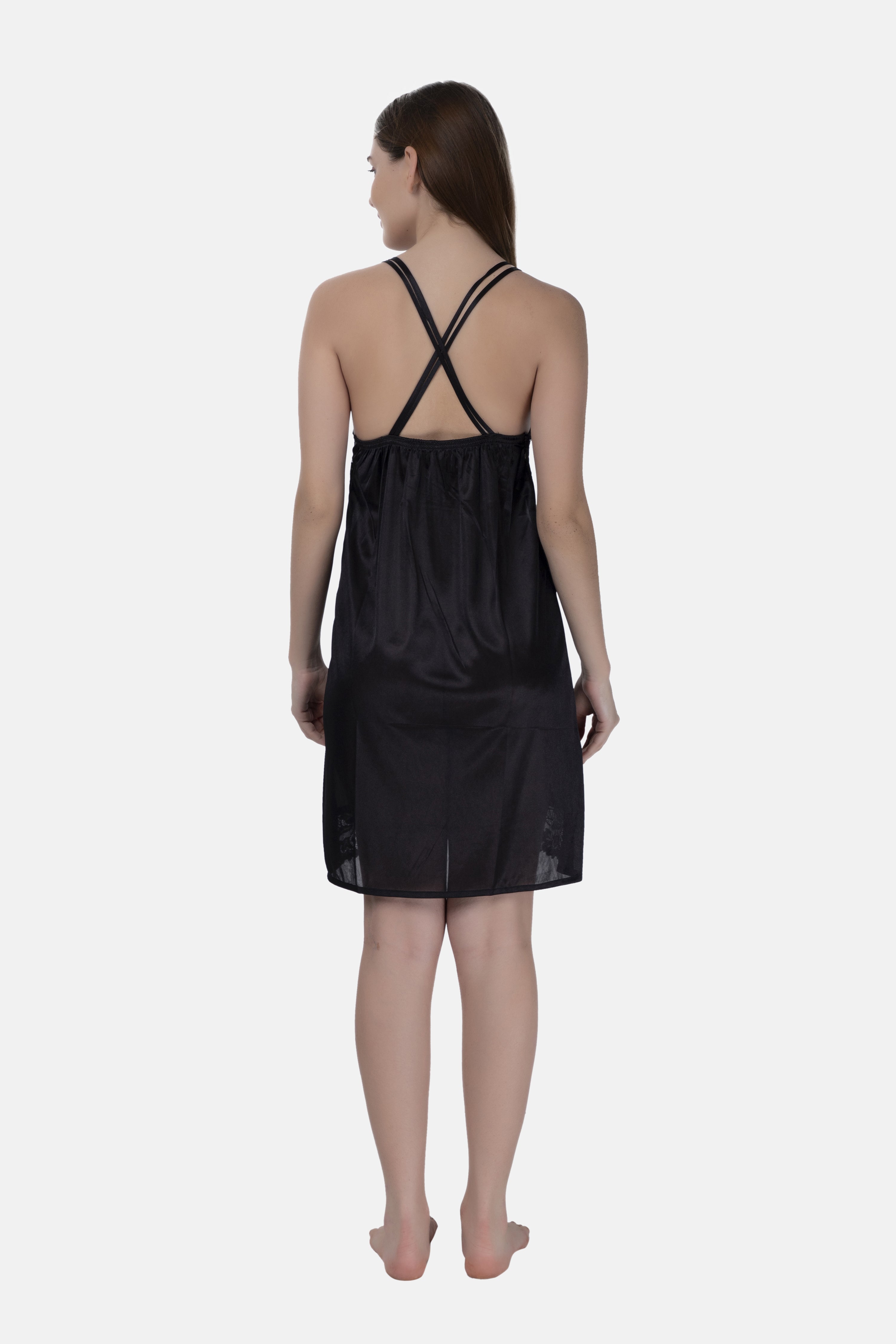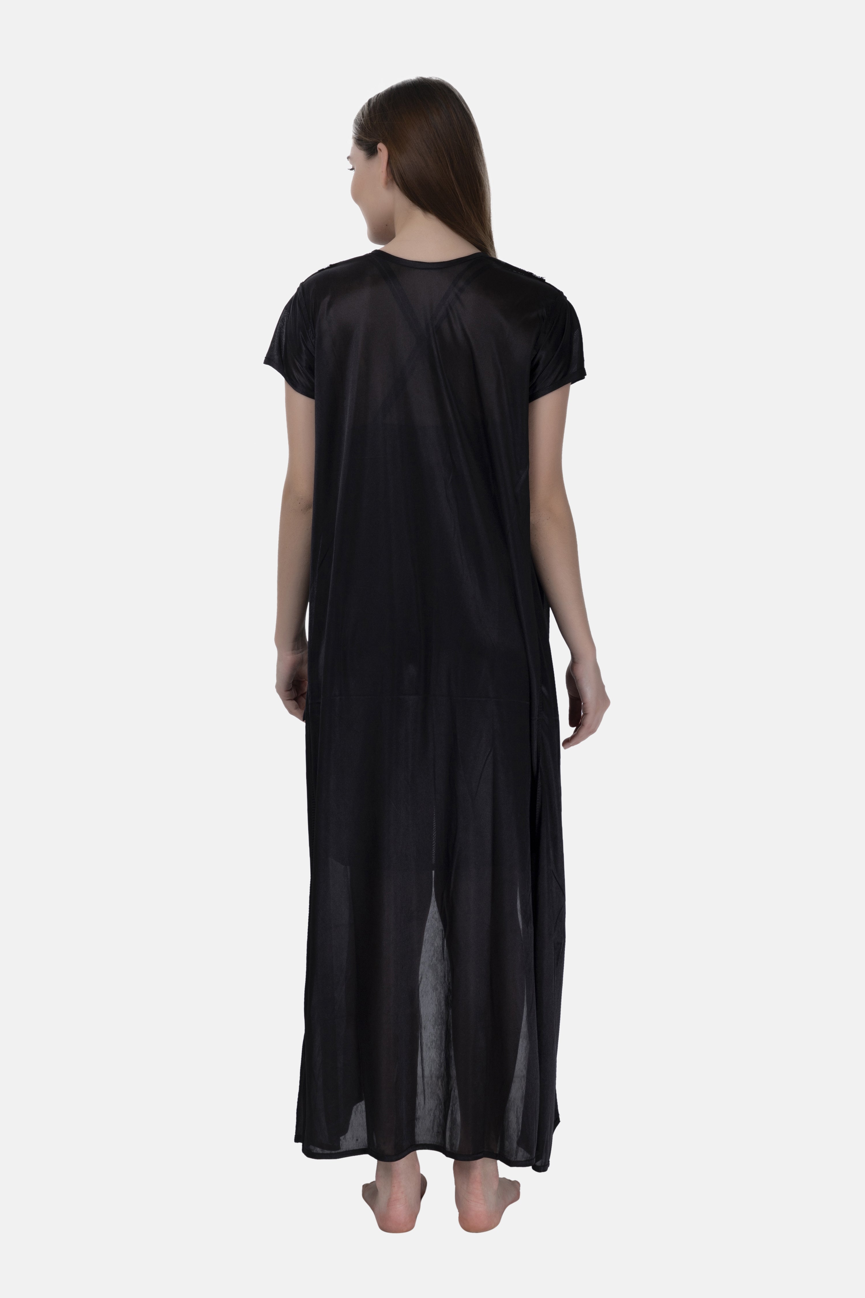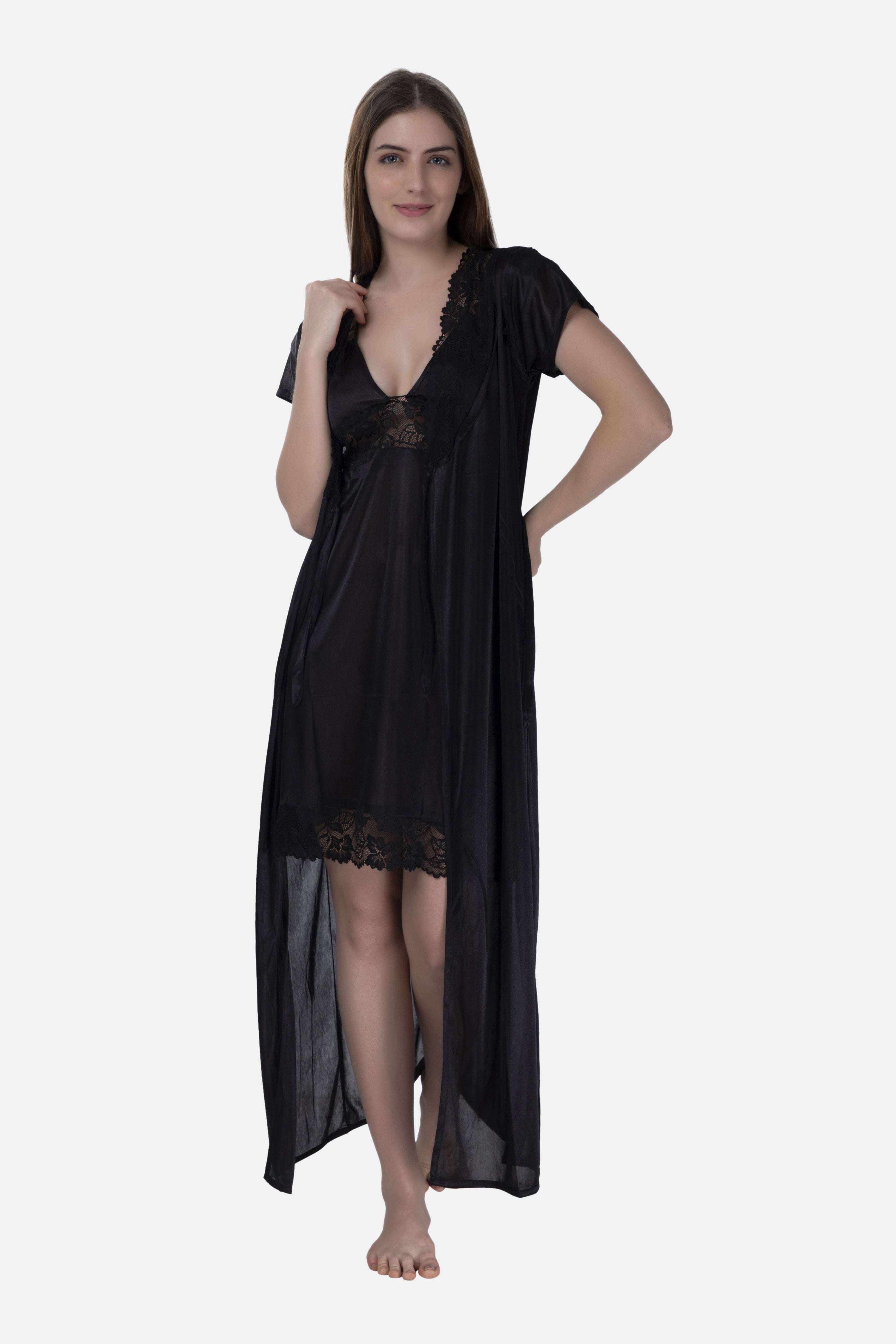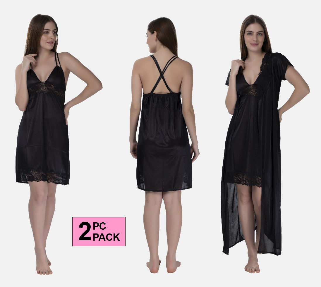 Poftik Satin Nighty with Robe 2Pc Set, Bridal Knee Length Night Dress Free-Size - Black, SKU- 2396