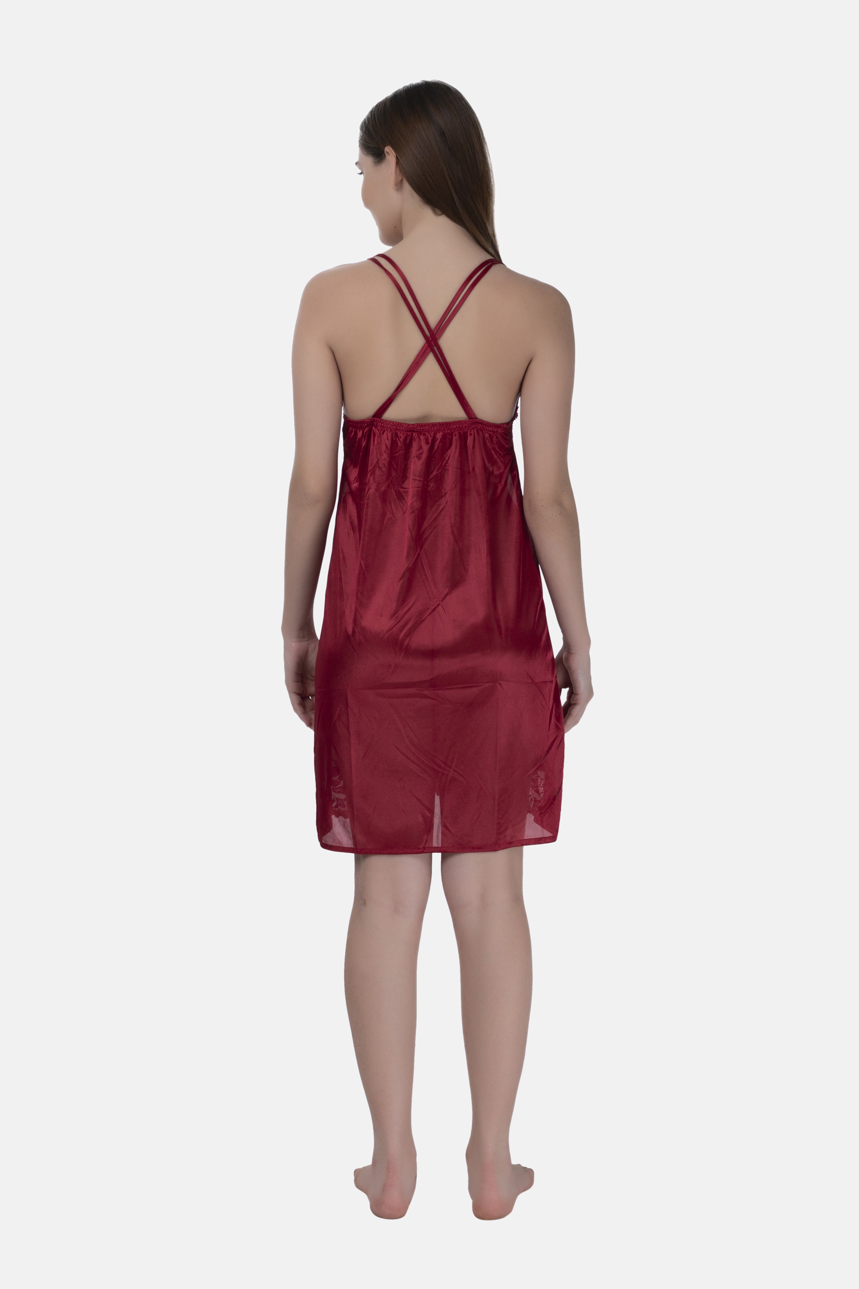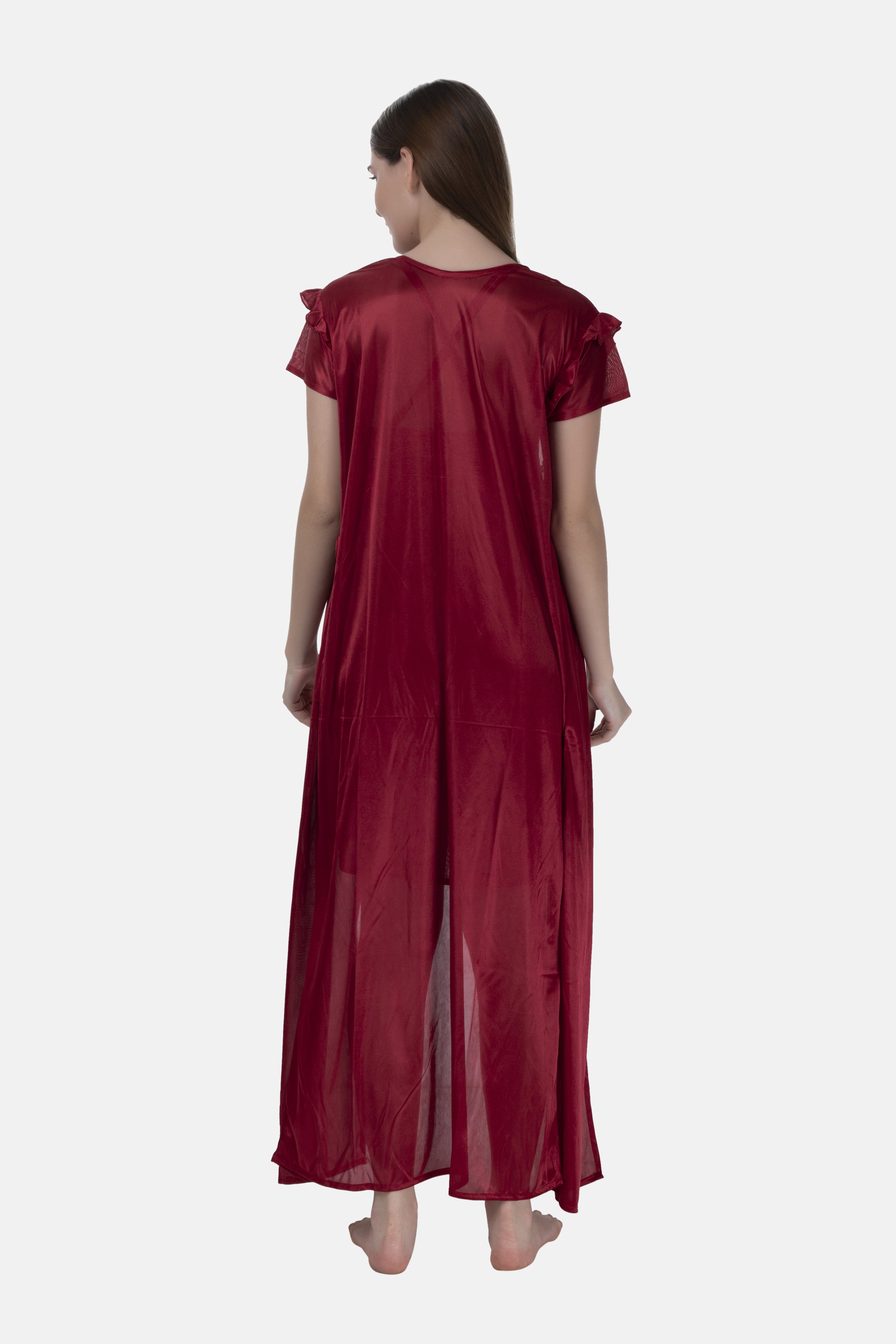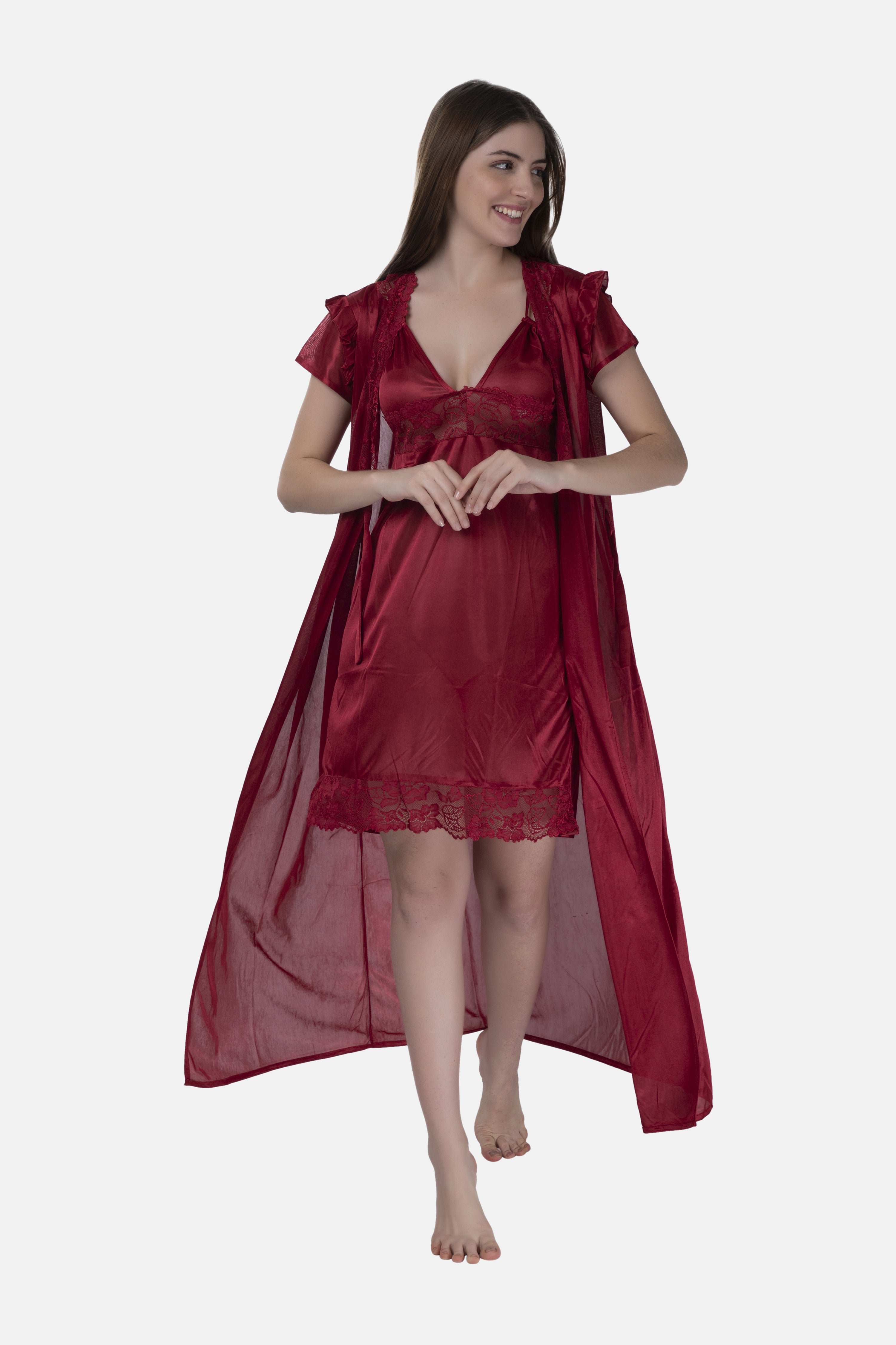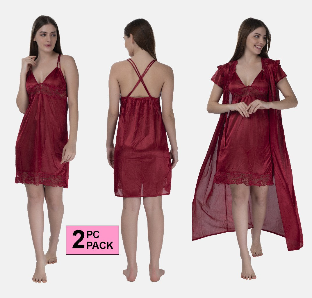 Poftik Satin Nighty with Robe 2Pc Set, Bridal Knee Length Night Dress Free-Size - Maroon, SKU- 2396