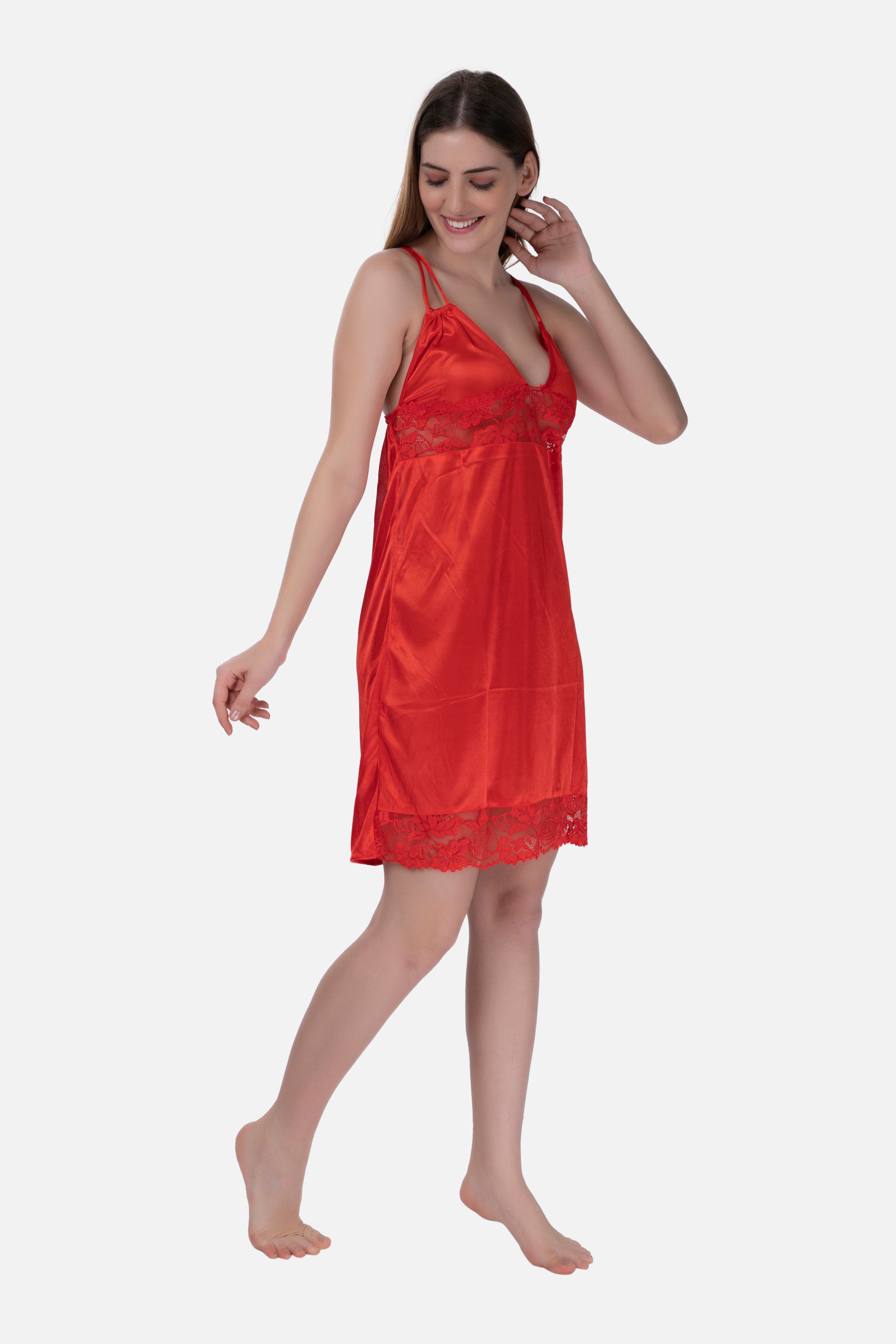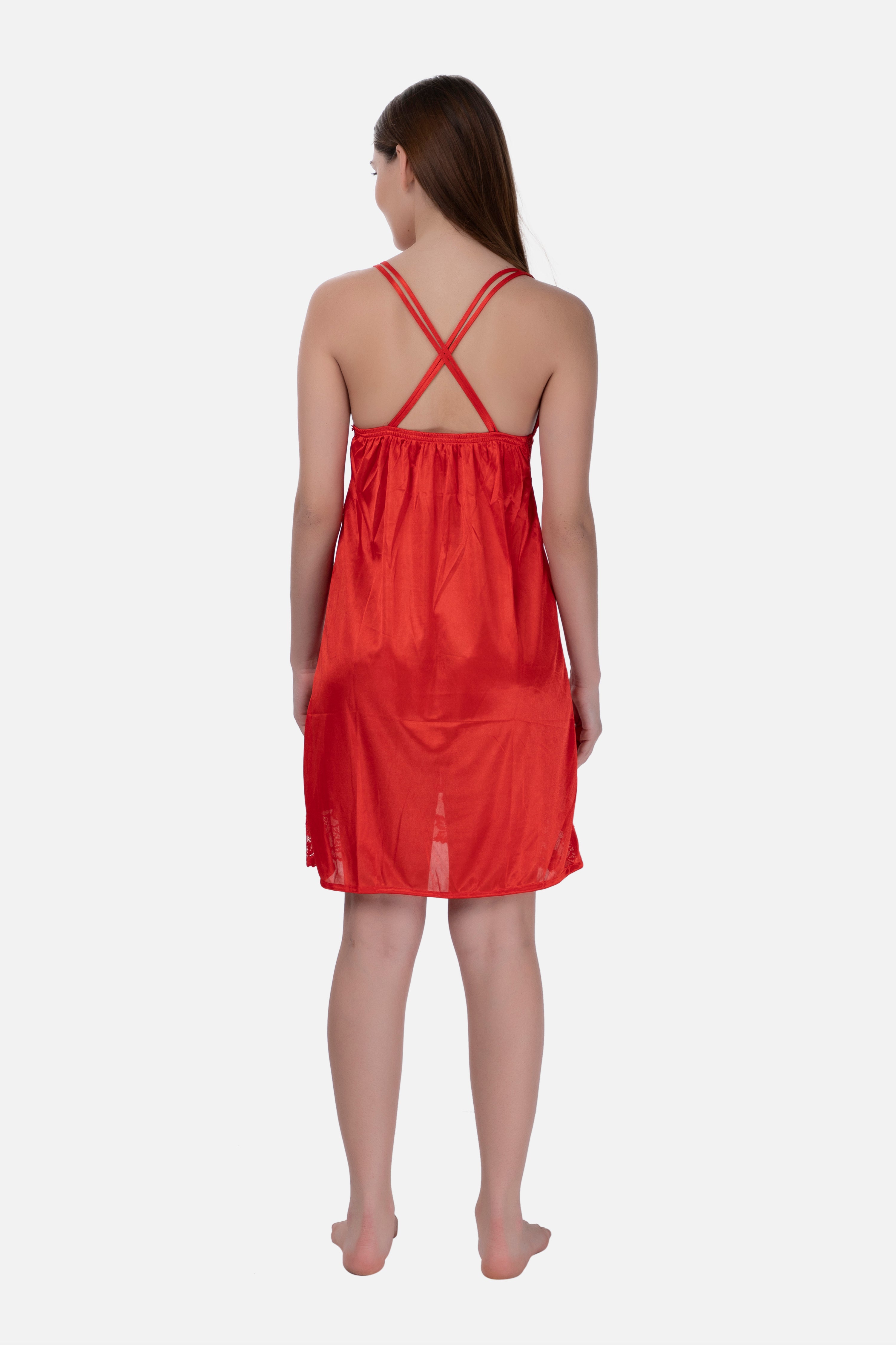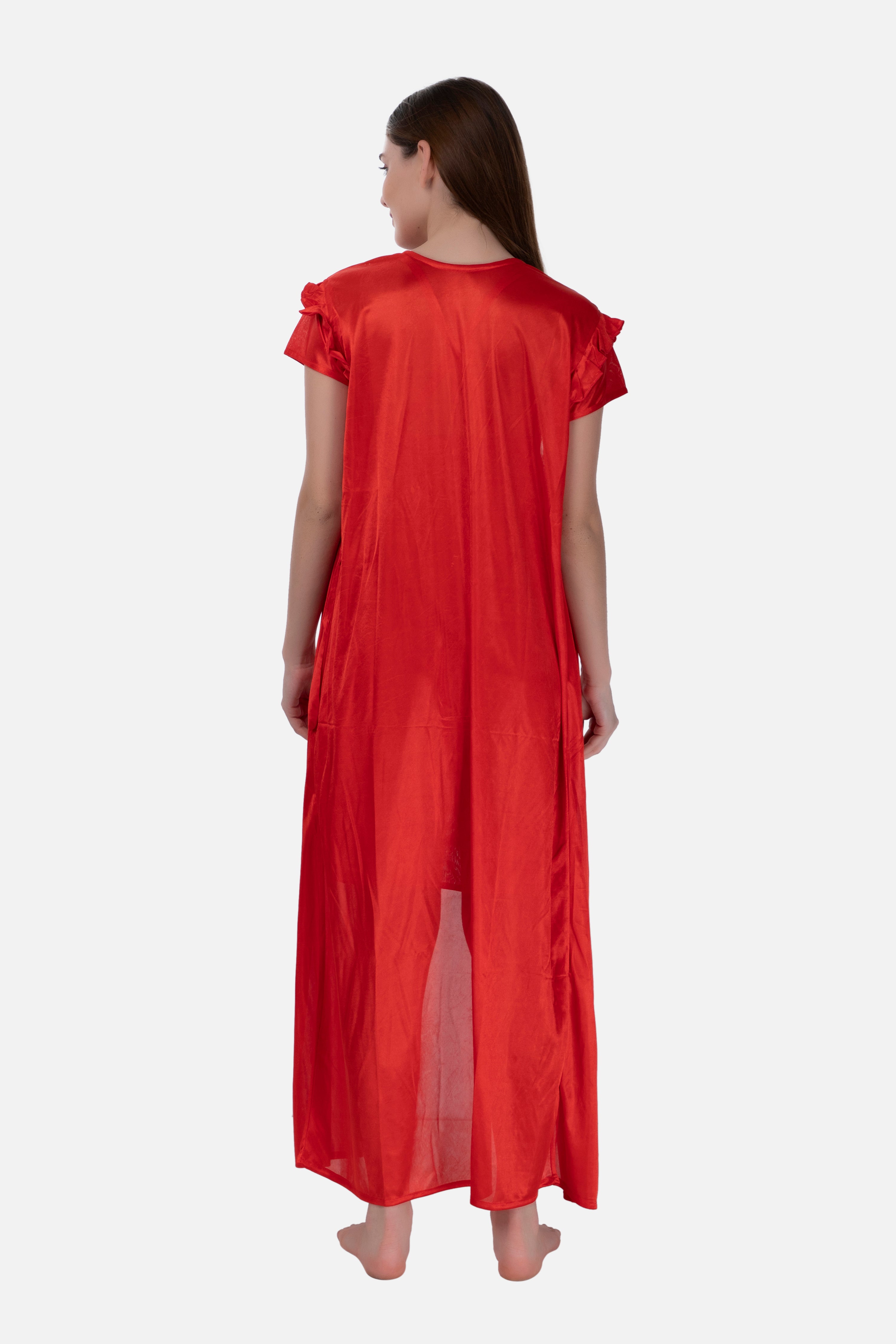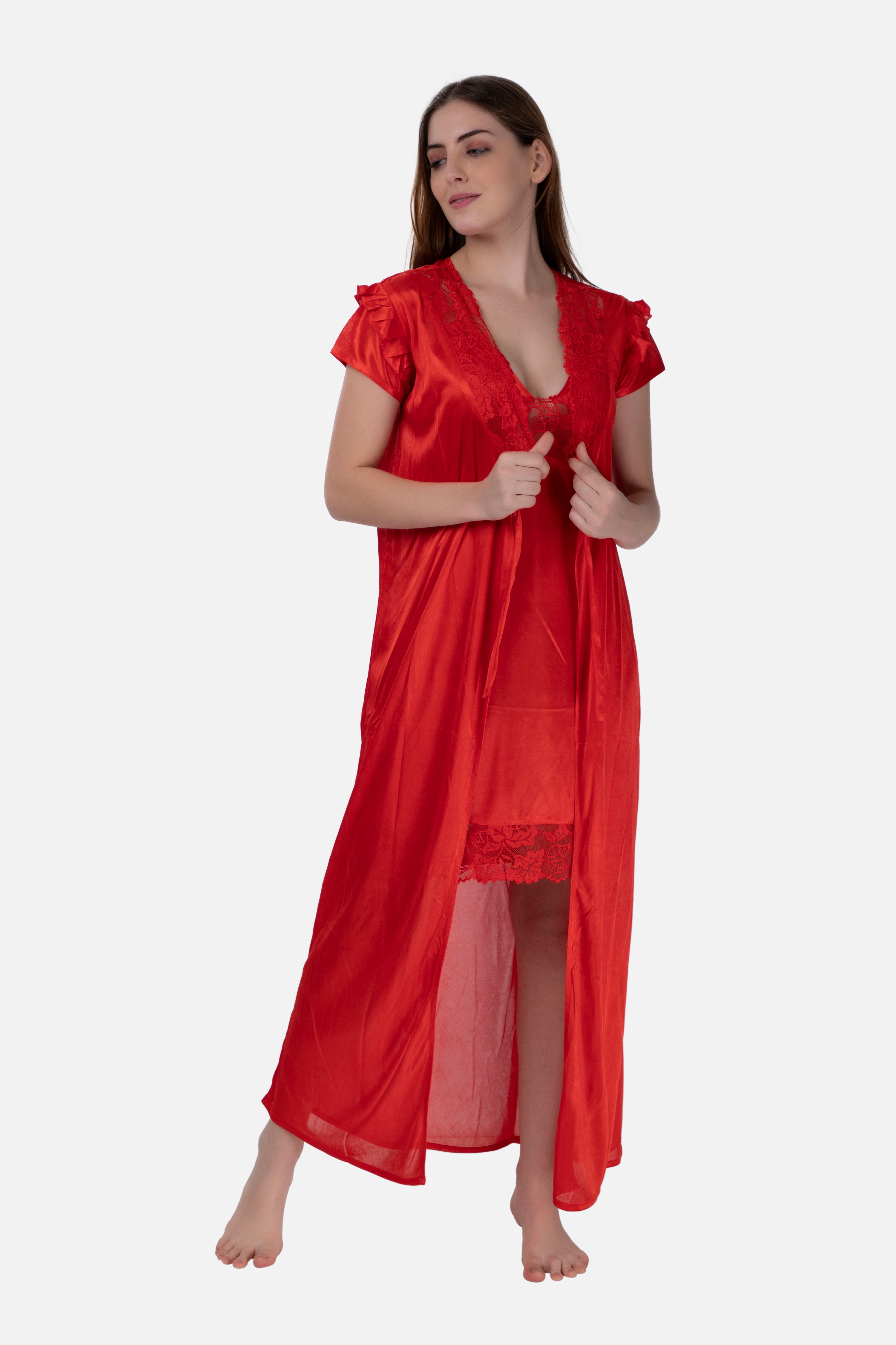 Poftik Satin Nighty with Robe 2Pc Set, Bridal Knee Length Night Dress Free-Size - Red, SKU- 2396