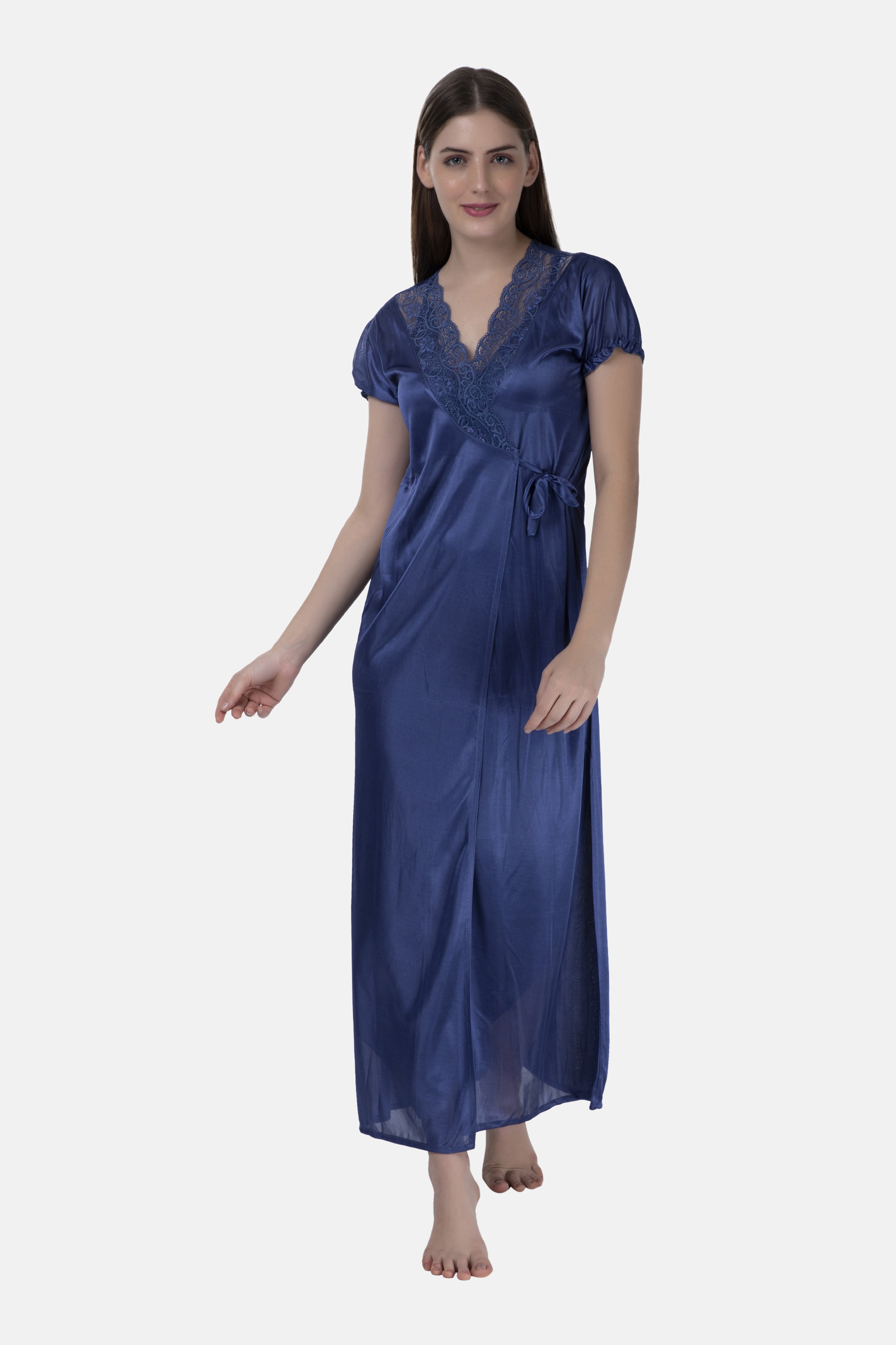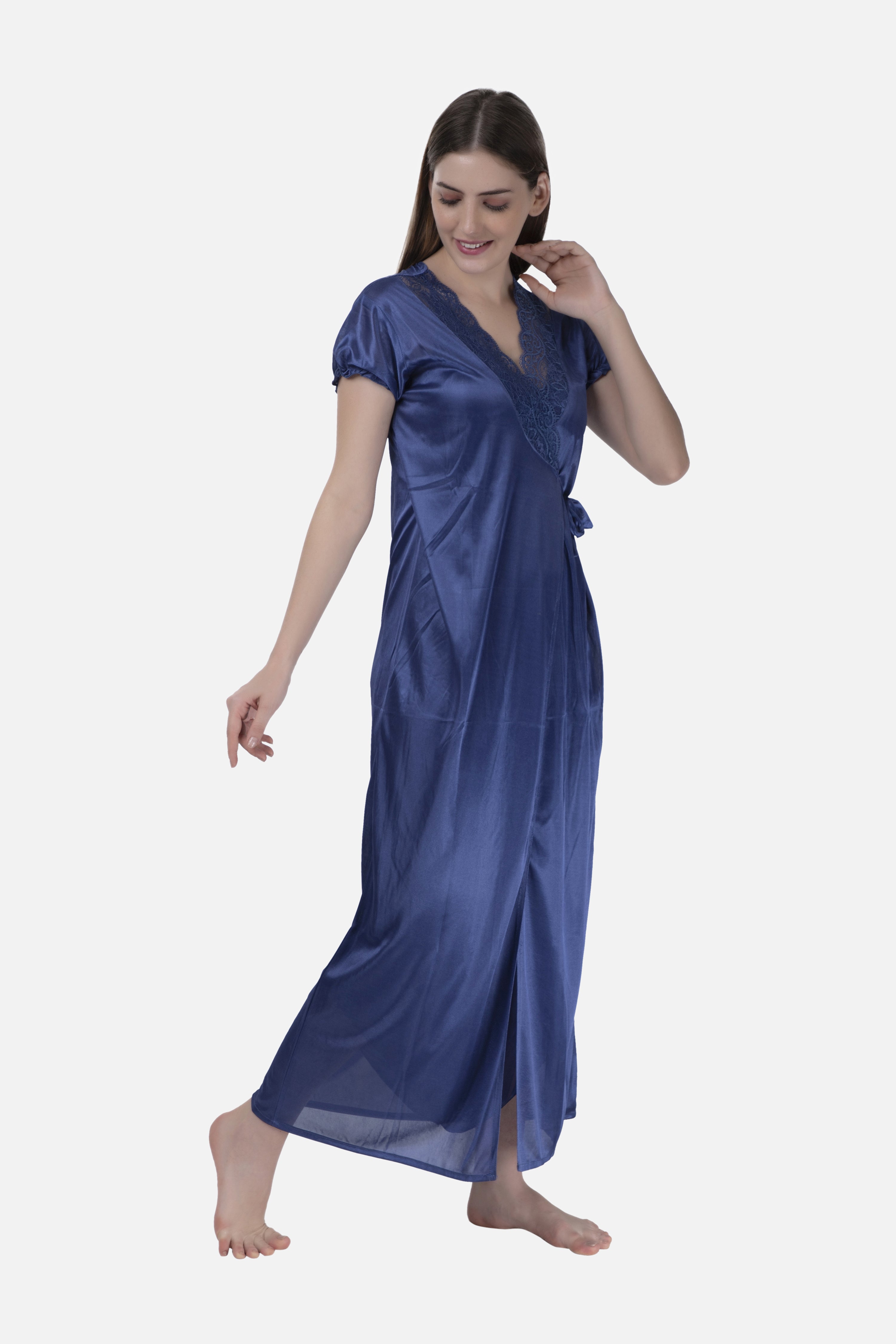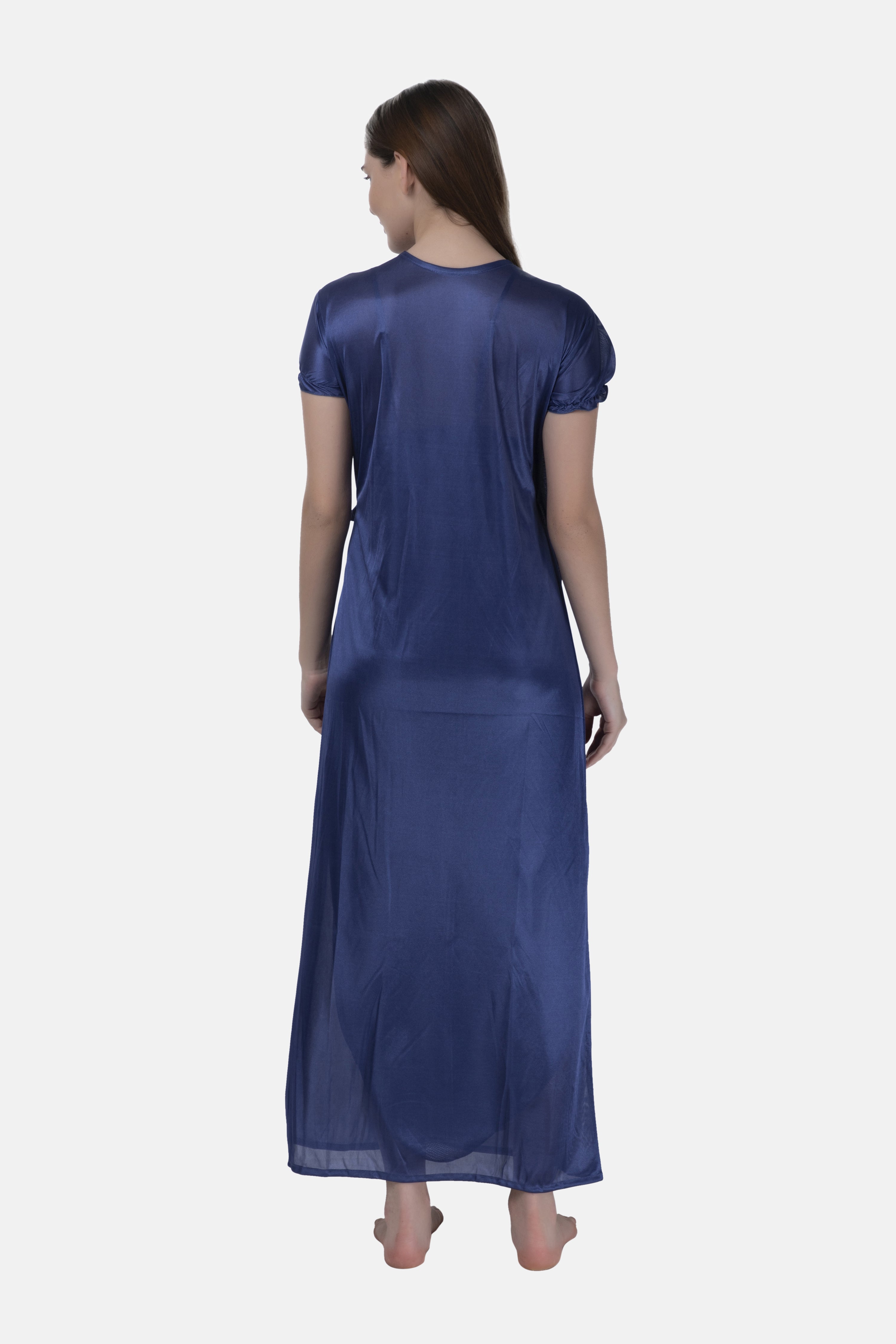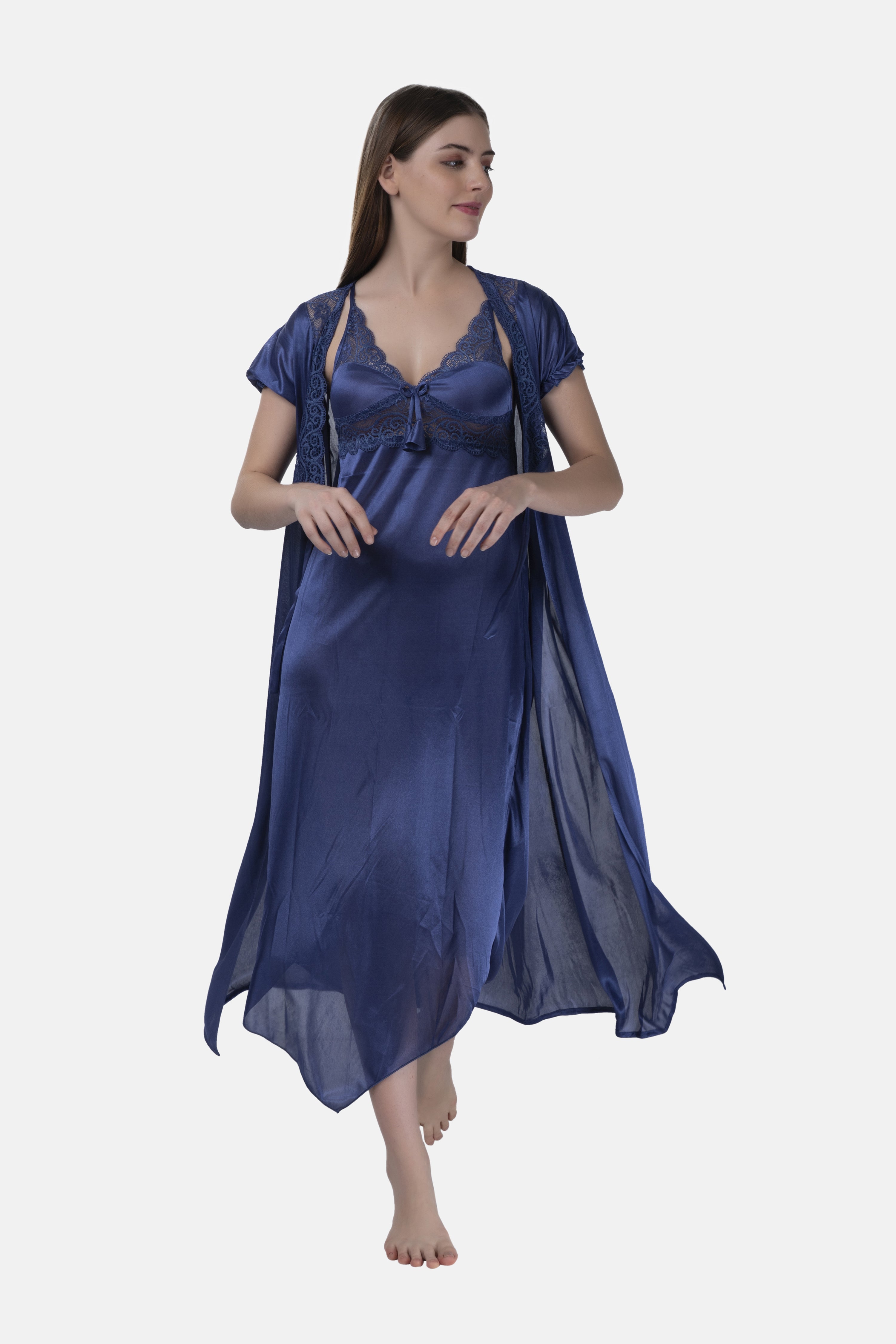 Poftik Satin Nighty with Robe 2Pc Set, Bridal Long Night Dress Free-Size - Blue, SKU- 2010